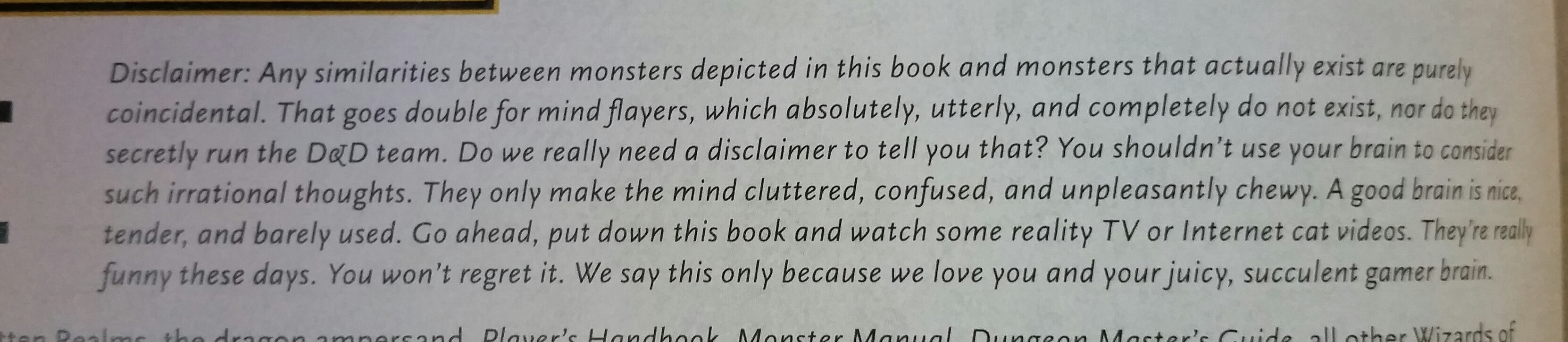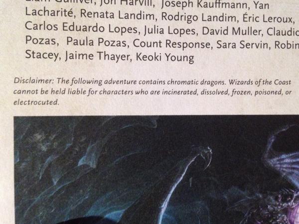 To a few of you it might sound strange to say this. But for me, I want to know that the people behind a product that I enjoy, enjoy it as well. It gives me confidence that the writers and creators are not just there to hit deadlines and collect a pay check. As a player and a designer, this is a hobby that you have to love. With Fifth edition I have caught glimpse here and there that the team are lovers of the game. Dropping little teasing disclaimers here and there is just one example. That they are enjoying the product they are making as much as I am reading and playing it.