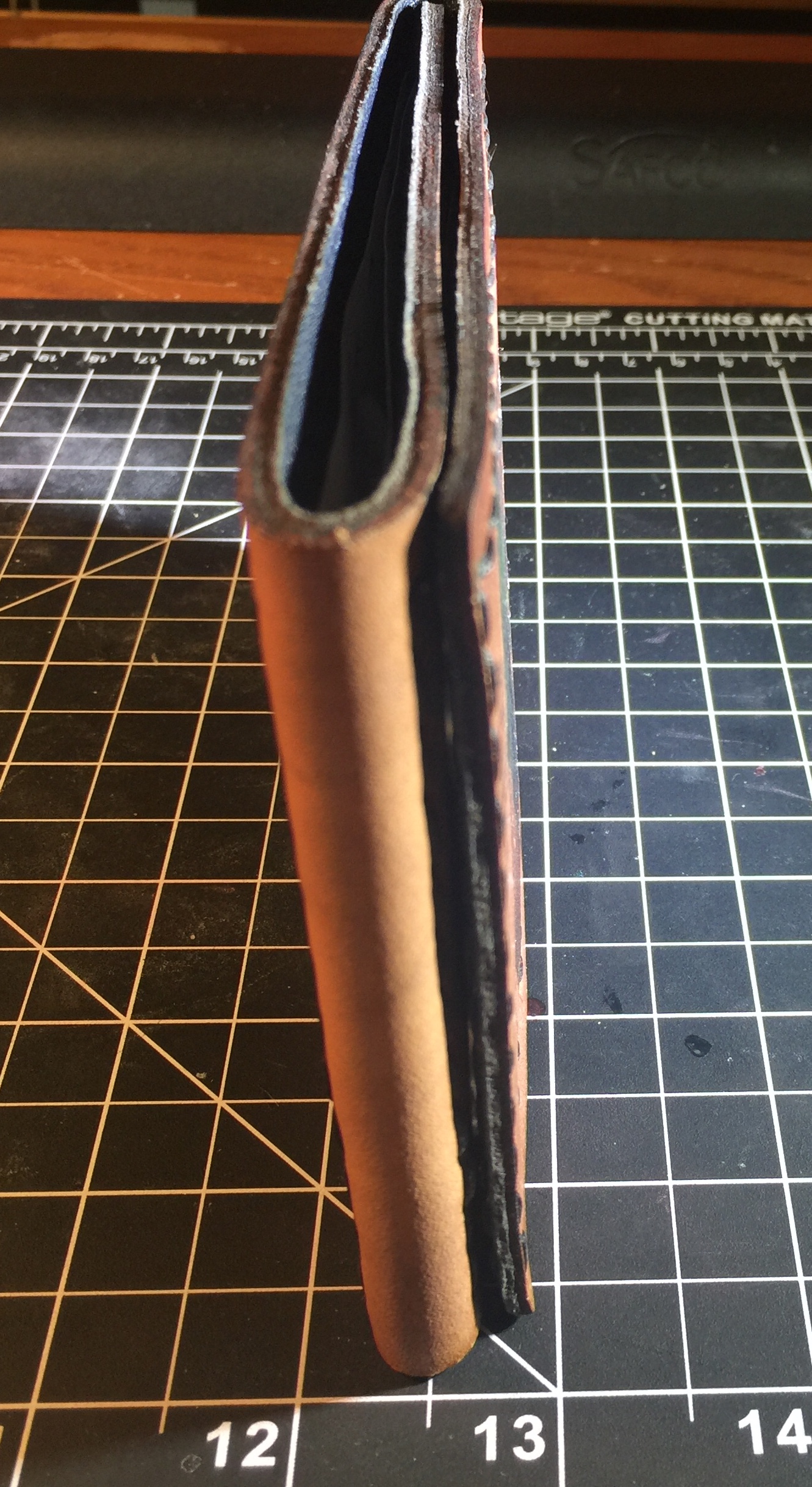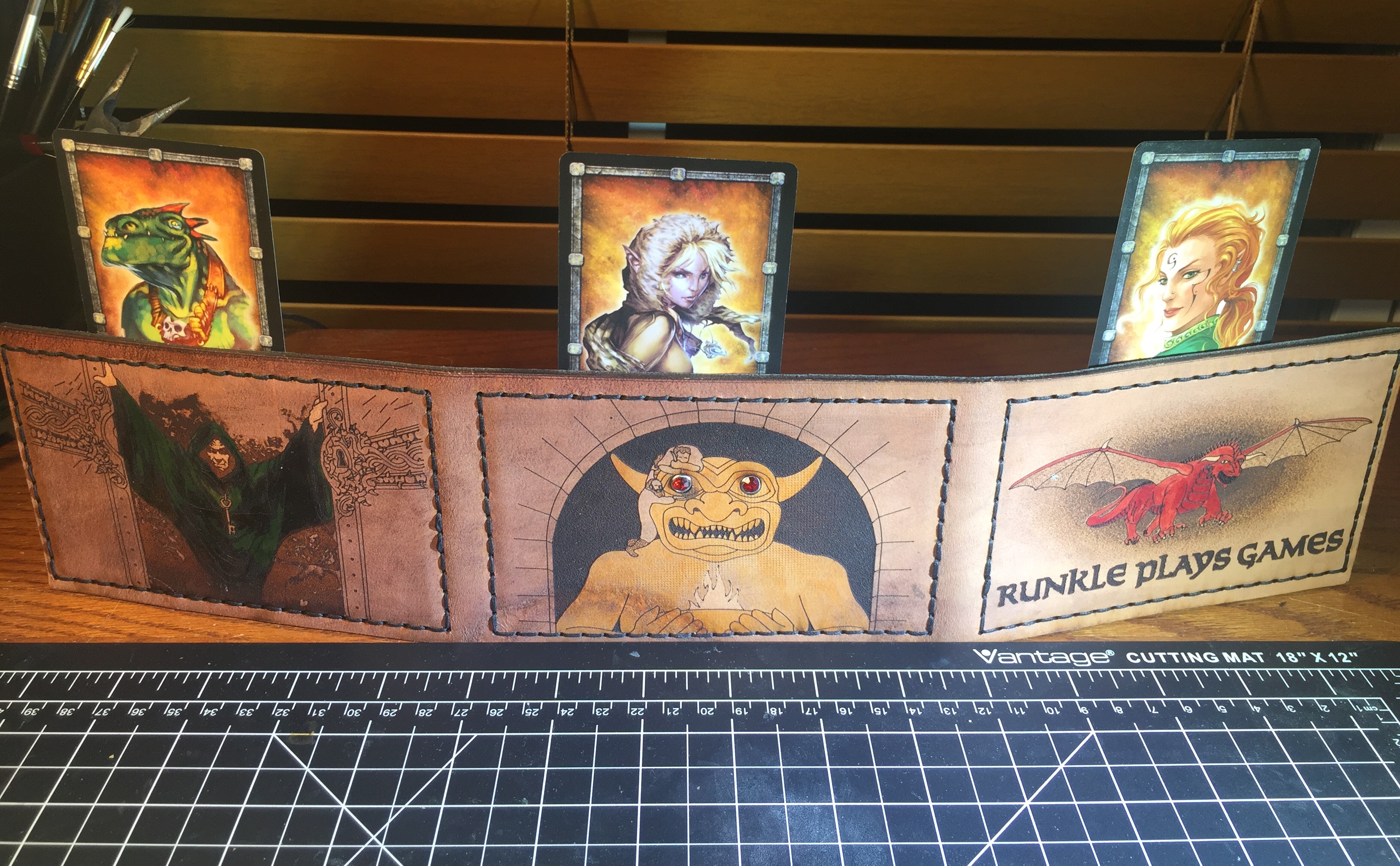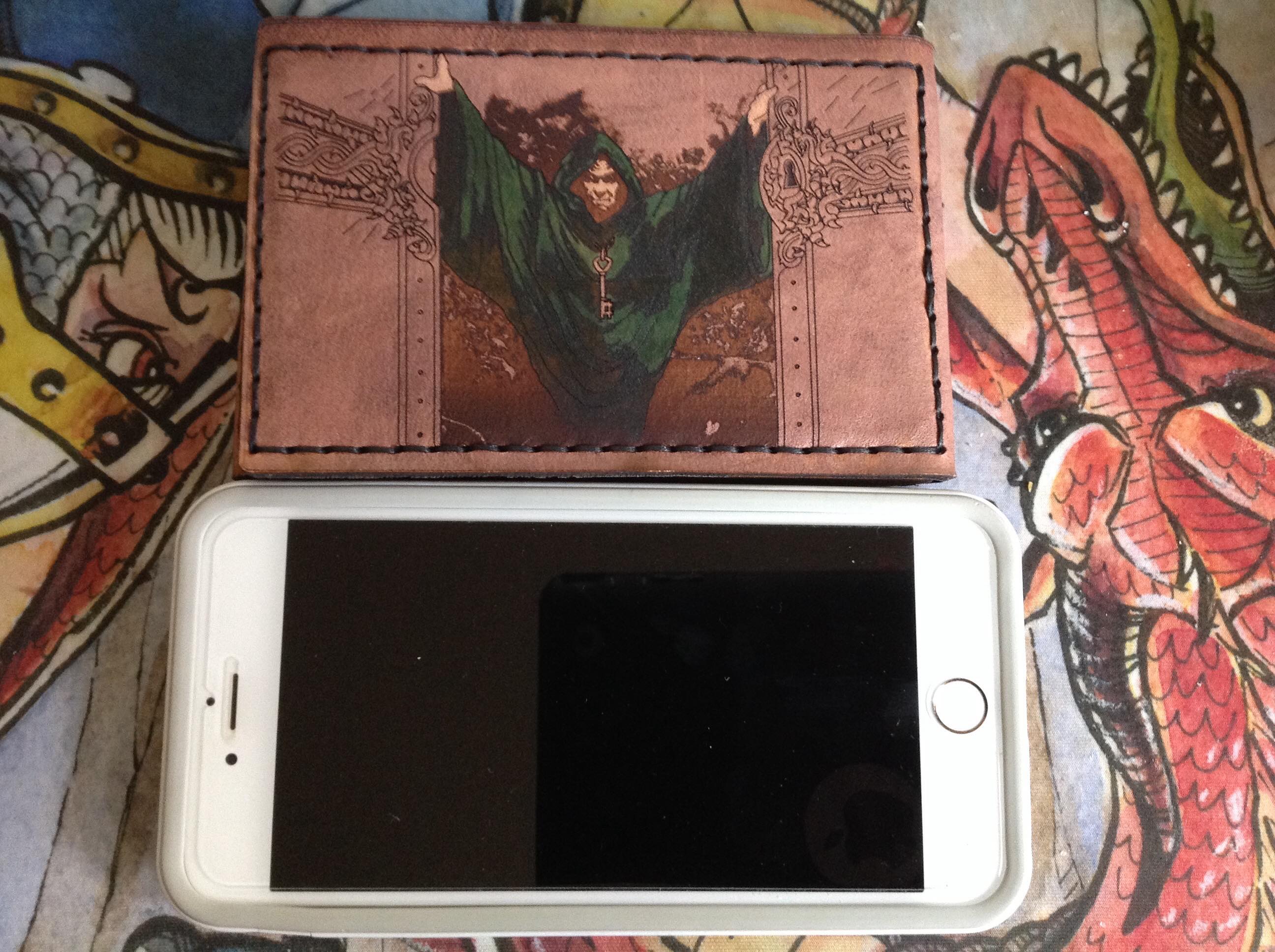 The game screen itself is nothing short of a work of art. The craftsmanship is top-notch. Its appearance will only get better with use as the leather ages. Taking on the character of the sessions, months and years of gaming it will see. The artwork is in the style of the first edition of D&D core books. This also complements the art on the Dice Cups that he crafts as well. This will make a nice looking set at the table of any game session. The screen itself measures just over 16 inches long and shy of 5 inches high. Making it large for some pockets but in reality, is only slightly bigger than my iPhone plus when folded. Thus making it perfect for travel for me. I use a couple of disk magnets to keep it game screen securely closed when not in use. It turned out looking amazing but a bit smaller than my first plan. I had originally wanted the screen sized for 4×6 inch index cards. But with the finished wallet in hand, I now think that it would have been too large.