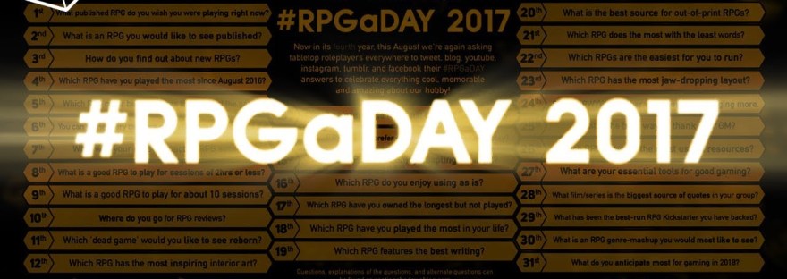 So as we draw to a close on #RPGaDay2017 I have decided like last year to put my thoughts to a page about the experience. I do this as I find myself a few days behind at this point in the whole thing and there is nothing wrong with that. Honestly, there is no solid… Continue reading Monday Muse on #RPGaDay 2017 Did I feel this year was a sucess?