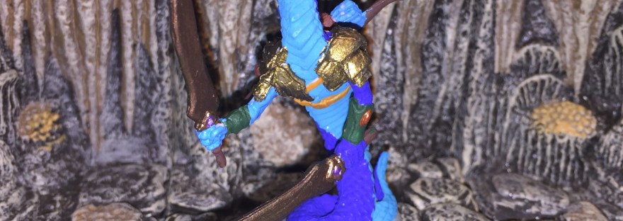 Today’s figure is a reaper bones snakeman warrior. He is wearing a pauldrons and bracers, wielding 2 swords, carrying a quiver and bow on his back. I like painting naga style monsters, because they are one of the races in my homebrew world.