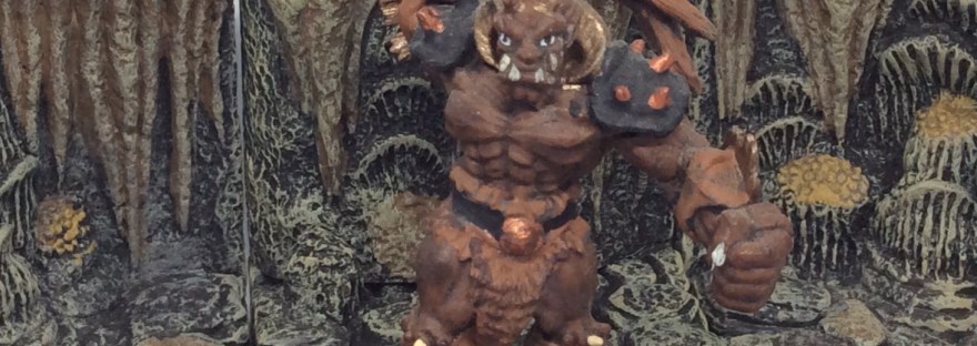 Doom Demon Today's figure is the pink demon from Doom. I painted it to look like an undead version of the original game monster. It appears to be a medium-sized Minotaur, with a hunched back (with protruding spine), overlarge head and three-toed feet. The closest Pathfinder creature that I could find to this is the… Continue reading Figure of the Week: Doom Demon