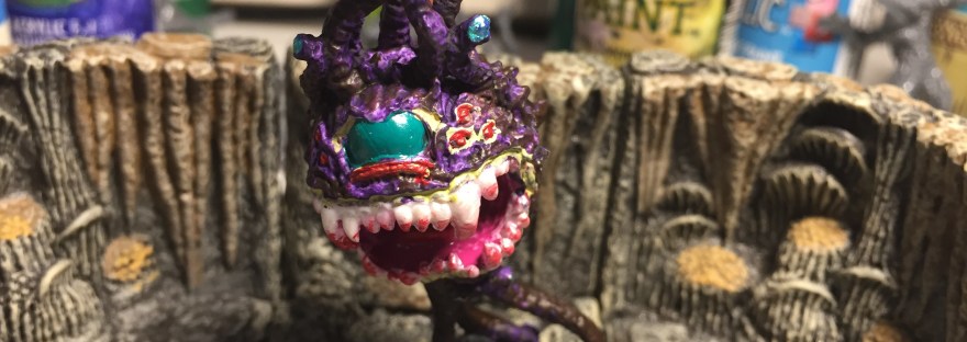 Today’s figure is a reaper bones Eye Beast. It is their version of a Beholder. It was fun to paint, I decided to go with a deep purple color scheme. I thought it was very interesting that even the tentacles that it stands on have eyes on them. Here a couple versions of this Monster… Continue reading Figure of the Week: Eye Beast