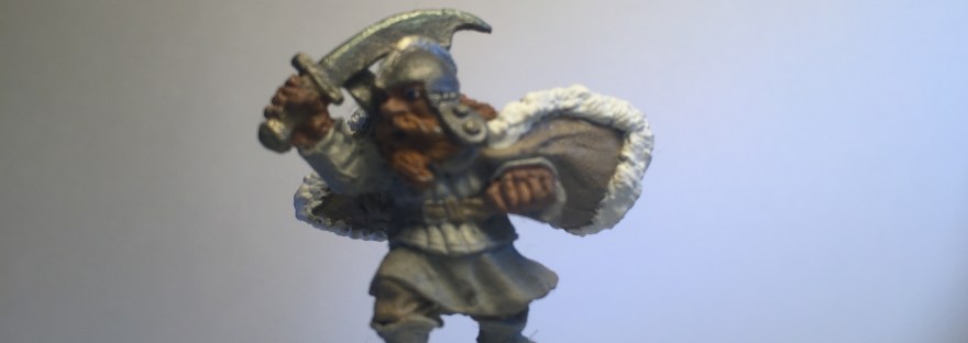 Ral Partha. This is a male dwarf of the far north with cloak, helm and scimitar. He is dressed for the cold, some people have told me that his colors are too drab, but that is on purpose.