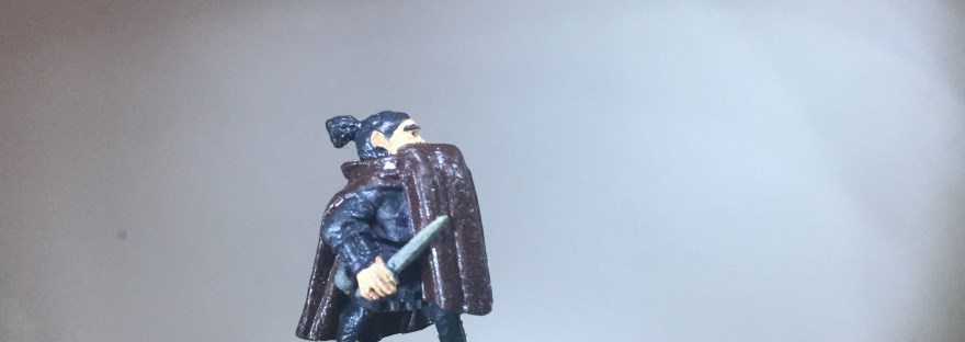 This week I'm featuring a vintage Ral Partha male halfling rogue. He's wearing a cloak with leather armor and a dagger. I Â painted his clothes dark because I needed a sneak thief for a character I was making.